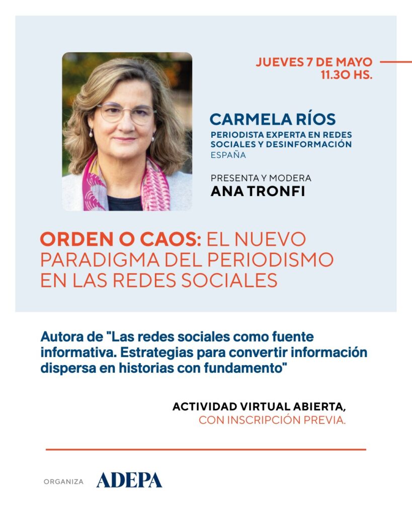 La velocidad de la información en el ecosistema digital plantea un desafío constante para las redacciones: ¿cómo distinguir el valor periodístico entre el ruido de las plataformas? Para abordar este interrogante, ADEPA organiza una charla virtual «Orden o caos: el nuevo paradigma del periodismo en las redes sociales”, a cargo de Carmela Ríos, autora de “Las redes sociales como fuente informativa: Estrategias para convertir información dispersa en historias con fundamento”